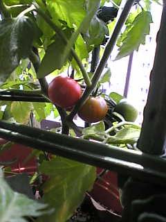ベランダ菜園で、中玉トマト1鉢、ミニトマト1鉢、ナス2鉢、万能ねぎ1鉢を育てています。